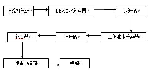 1.2.為了保障進(jìn)入噴咀的空氣為潔凈帶濕度的熱空氣,需將壓縮機(jī)產(chǎn)生的氣體進(jìn)行油水分離,油水分離過(guò)濾器采用預(yù)過(guò)濾及精過(guò)濾、除油過(guò)濾三級(jí)過(guò)濾方式,高分子化合材料制成的濾芯有效地去除壓縮空氣中的油、水及埃粒子。放在進(jìn)入飽和器前的位置,力求做到盡最大的能力除油污。
